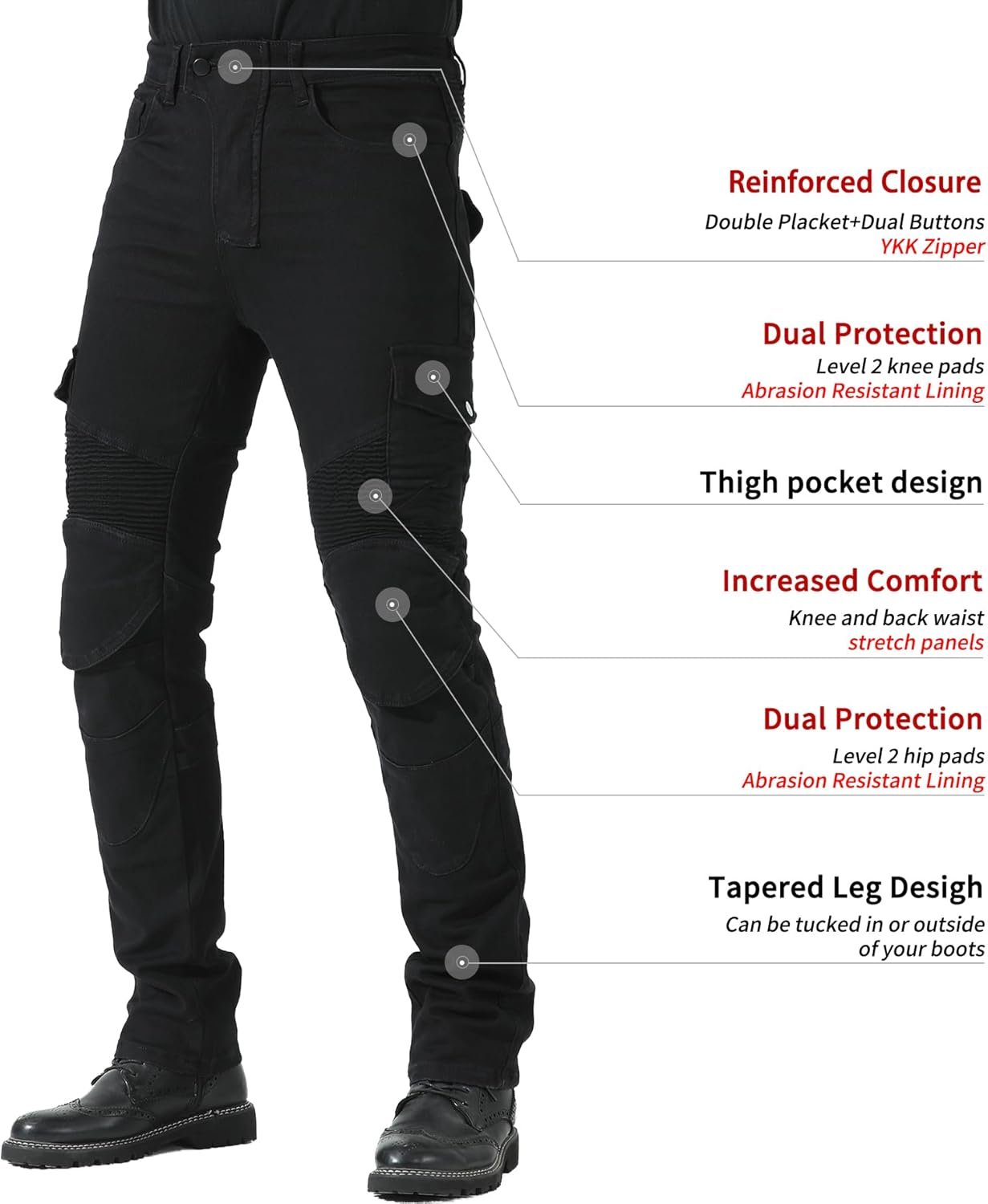 Professional Cycling Design:YKK Zipper & Double Placket & Dual Buttons will make the motorcycle jeans durable.Elastic panels on the knee and back waist provide the rider with greater flexibility and comfort.