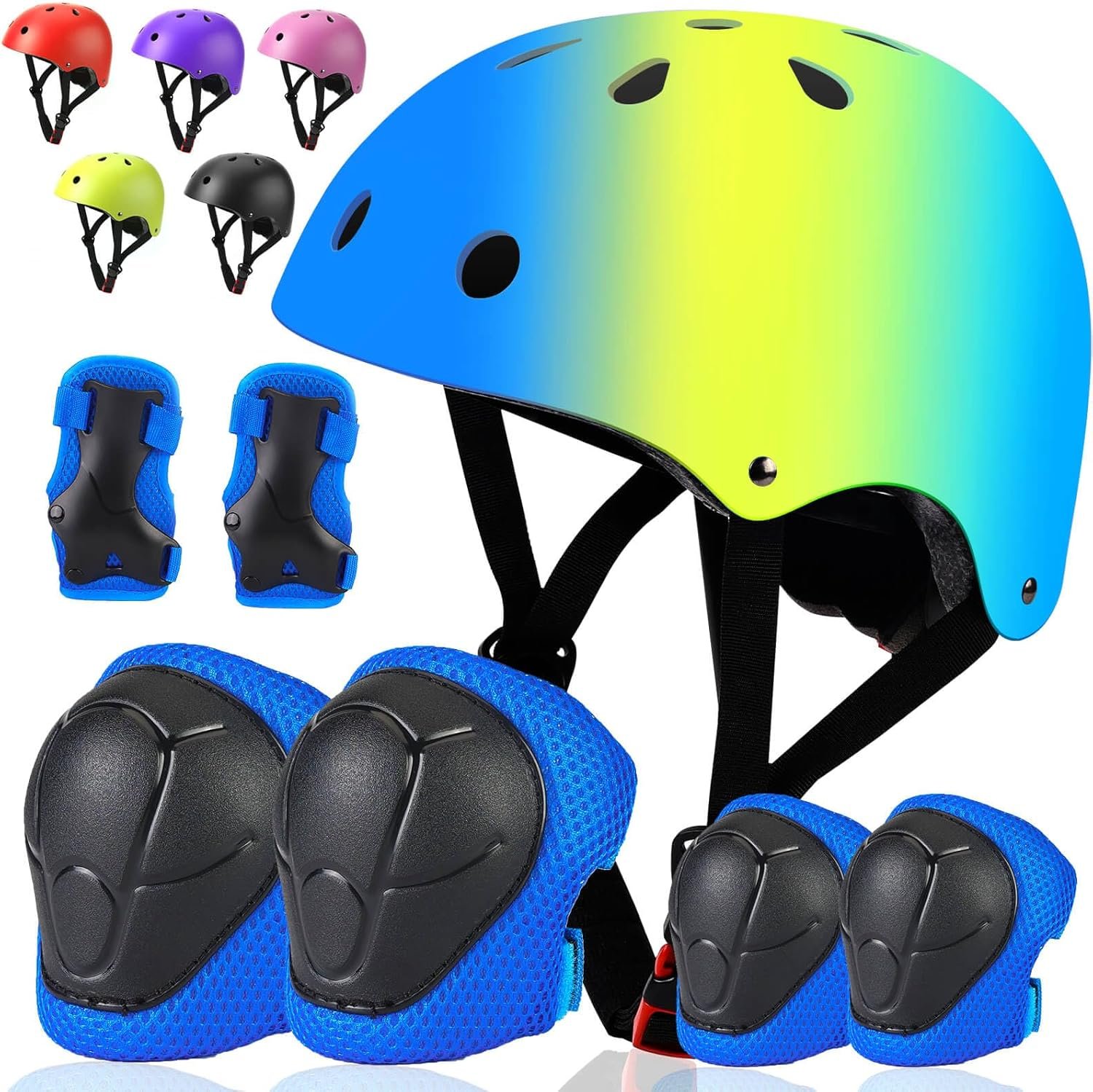 • 【 Kids Bike Helmet & 7 in 1 Protective Gear Set】Package including: 1*helmet, 2*Wrist Pads, 2*Knee Pads, 2*Elbow Pads. This toddler bike helmet and wrist guard, elbow pad, and knee pad set create a safe outdoor play experience for children